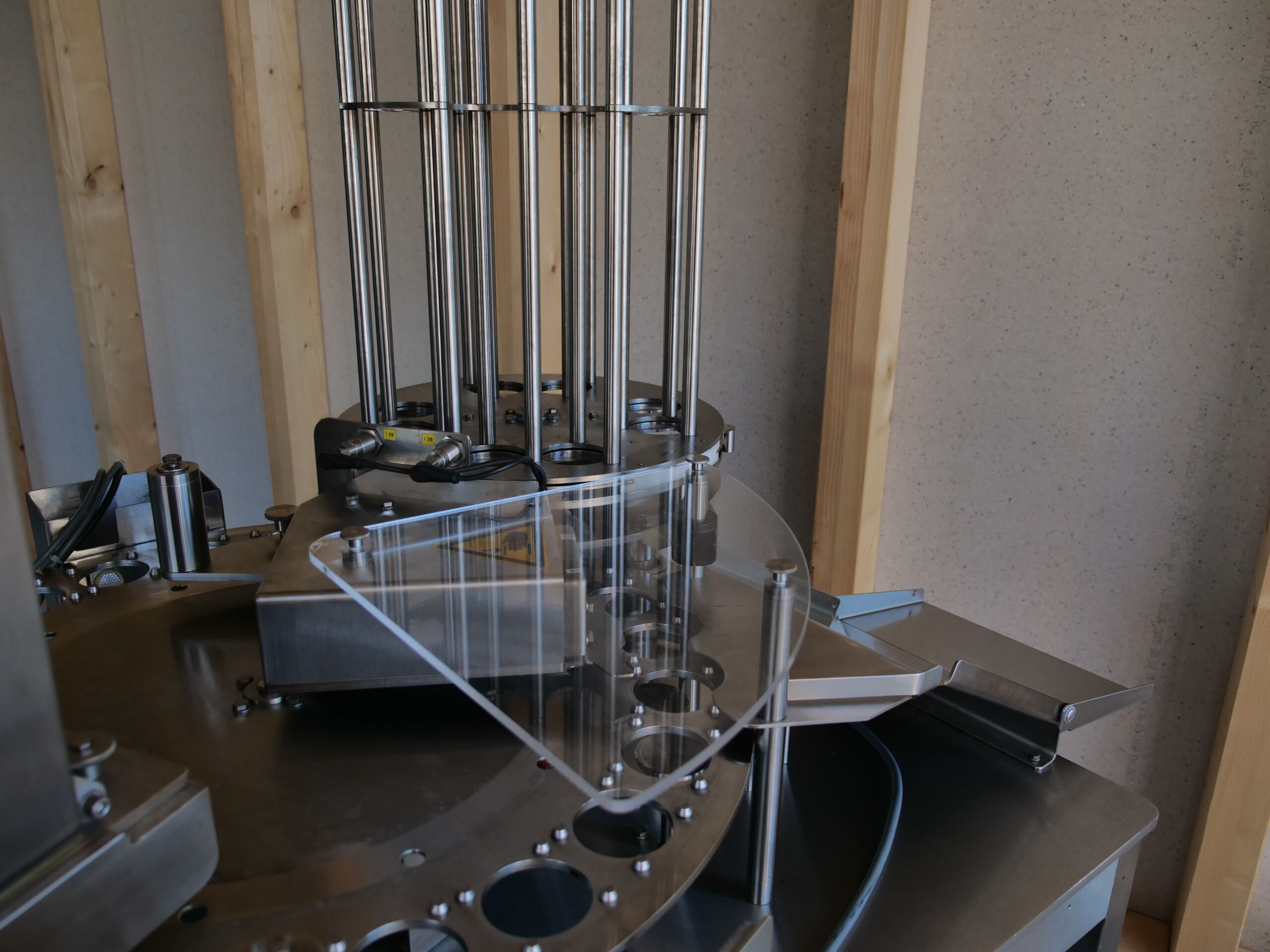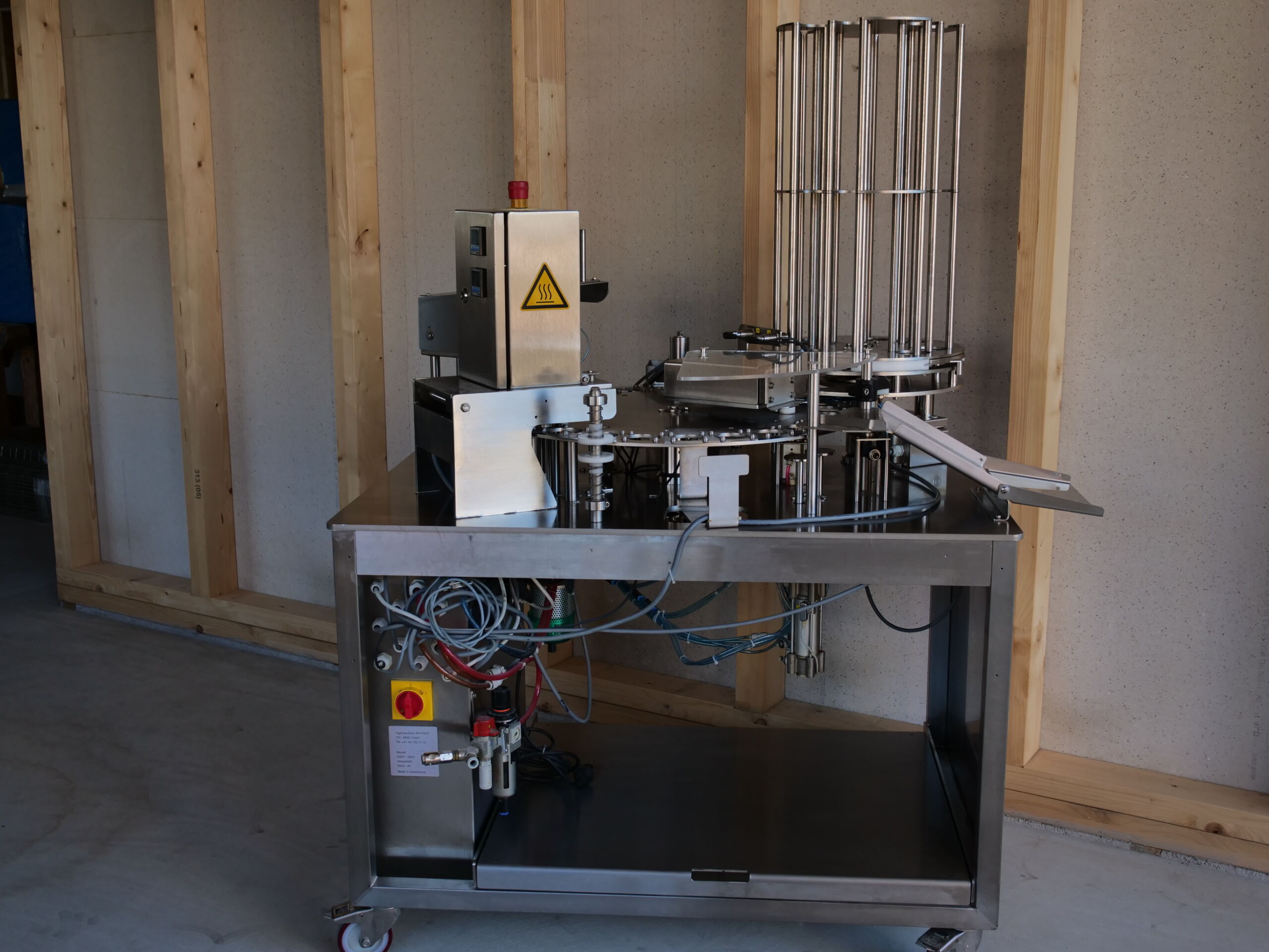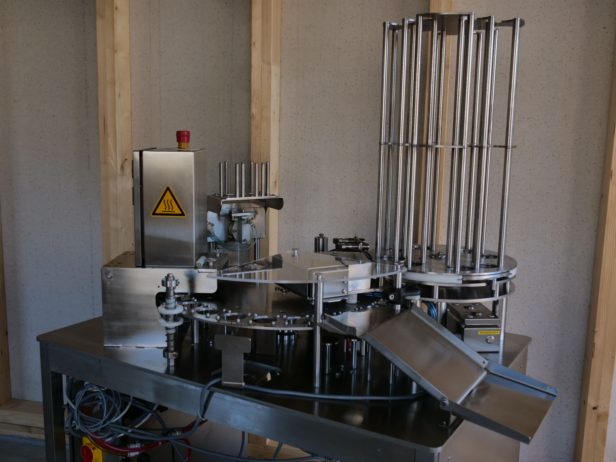 Die Kunststoffbecher werden automatisch aus einem Magazin gespendet und anschliessend befüllt. Sowohl Foliendeckel aus Alu- oder Kunststoff als auch Schnappdeckel werden aus einem Magazin auf die Becher gespendet und danach verschweisst oder angedrückt.