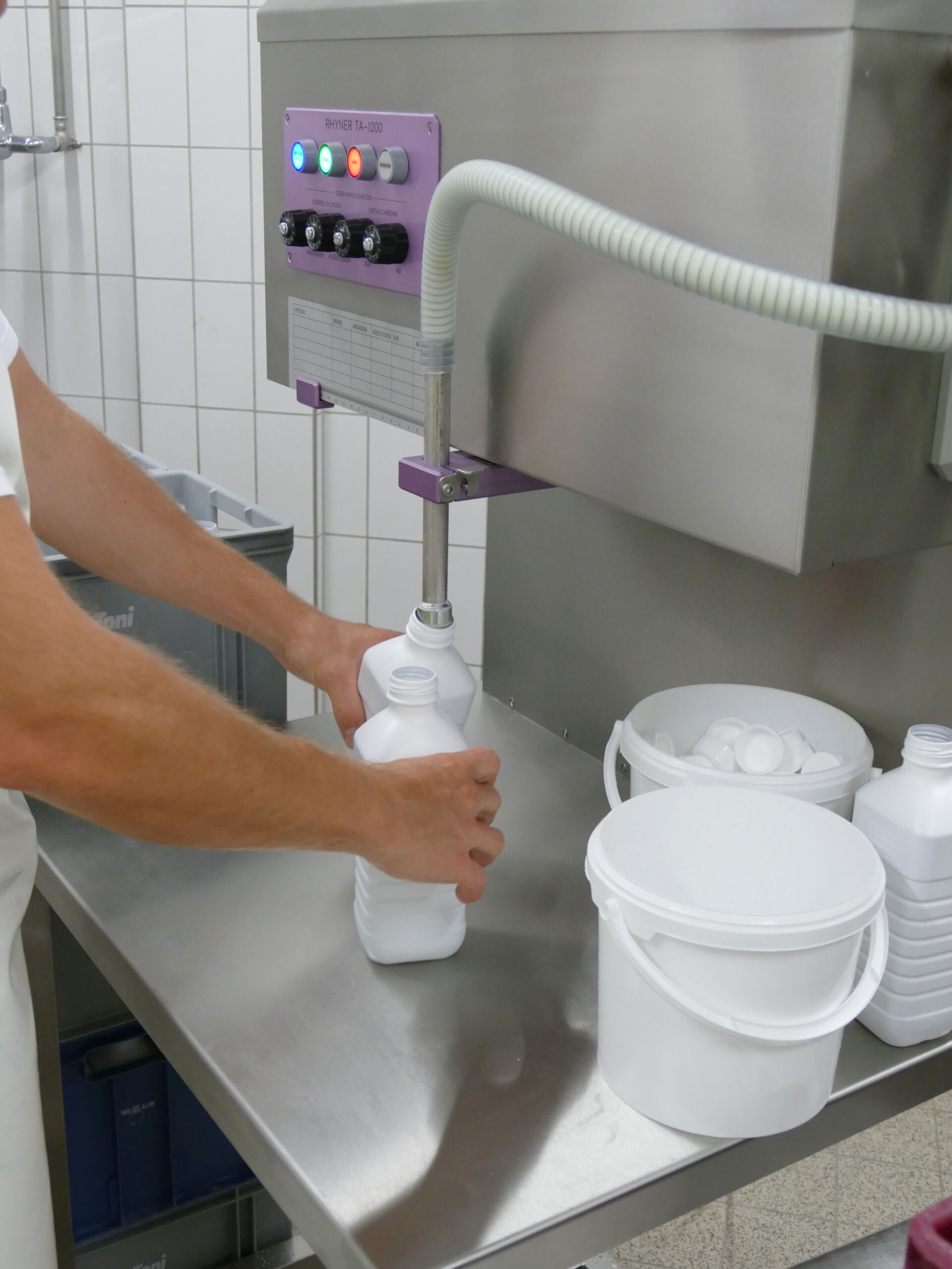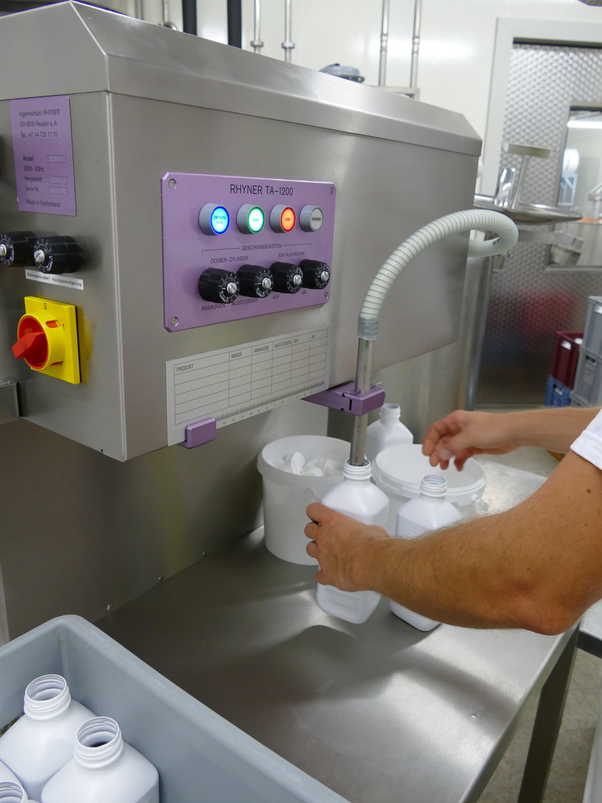 Unsere Abfüllmaschinen arbeiten mit einem äusserst zuverlässigen, wartungsarmen und hygienisch einwandfrei Kolbendosierer. Dieses Prinzip hat sich während der letzten 25 Jahre bewährt.